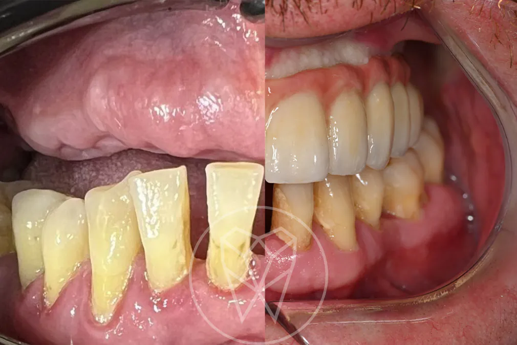 Dzięki planowaniu cyfrowemu i szablonom chirurgicznym uzyskaliśmy precyzyjne pozycjonowanie implantów oraz nowy uśmiech. W dniu zabiegu pacjent otrzymał natychmiastowe, stałe uzupełnienie tymczasowe. Po wygojeniu i osteointegracji, po 6 miesiącach, wykonaliśmy pracę ostateczną w pełnej ceramice – trwałą i naturalnie odwzorowującą uśmiech.